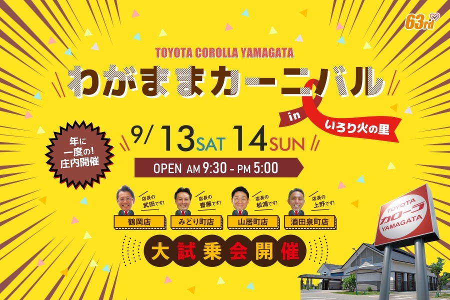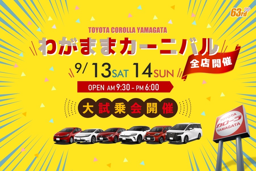 わがままカーニバル 2025.09.12 カローラ山形では明日より2日間 「わがままカーニバル」を全店で開催! 山形・村山・置賜地区 庄内地区 *庄内地区は年に一度の「いろり火の里」で開催されます 各店さまざまな催し物や特典を準備して皆様のご来場をお待ちしております お近くにお越しの際はぜひお立ち寄りください スタッフ一同皆様のお越しを心よりお待ちしております 前の記事へ チェリーズスマイル ブログ一覧に戻る 次の記事へ