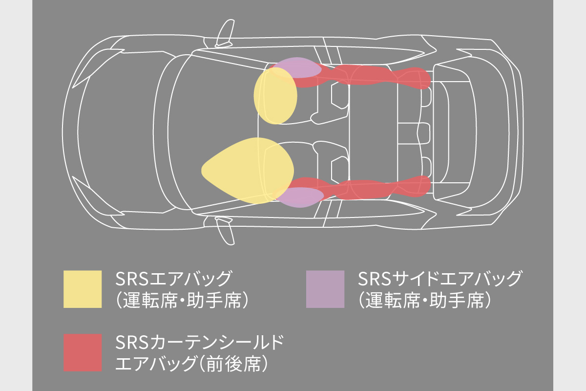 SRSエアバッグ(運転席・助手席)+SRSサイドエアバッグ(運転席・助手席)+SRSカーテンシールドエアバッグ(前後席)